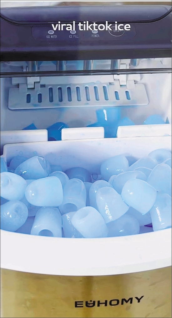 TikTok博主@VanillaCrush将草莓酱滴入EUHOMY制冰机的透明冰格,淡粉色的冰块在镜头前逐渐成型,她捏起一颗粉色冰块放入口中,下一秒,一声清脆的“咔哒”回响在视频里。这条“草莓冰块制作教程”视频发布后迅速登顶热门榜单,播放量达到500万次,评论区被“求链接”的留言刷屏。