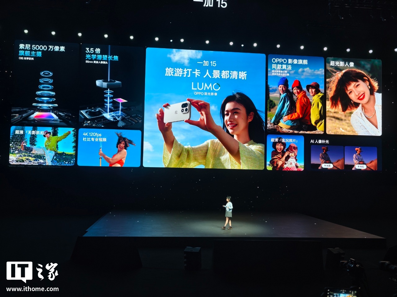 在影像上,一加 15 手机首次搭载 OPPO「LUMO 凝光影像」,号称“一加有史以来拍照效果最好的产品”。新机搭载索尼 5000 万像素旗舰主摄,具备 OIS 光学防抖 + OPPO 旗舰影像算法;搭载 3.5 倍光学潜望长焦,支持 85mm 黄金人像镜头;可实现 4K 120fps 杜比专业视频、超光影人像、超清实况照片、AI 人像补光。